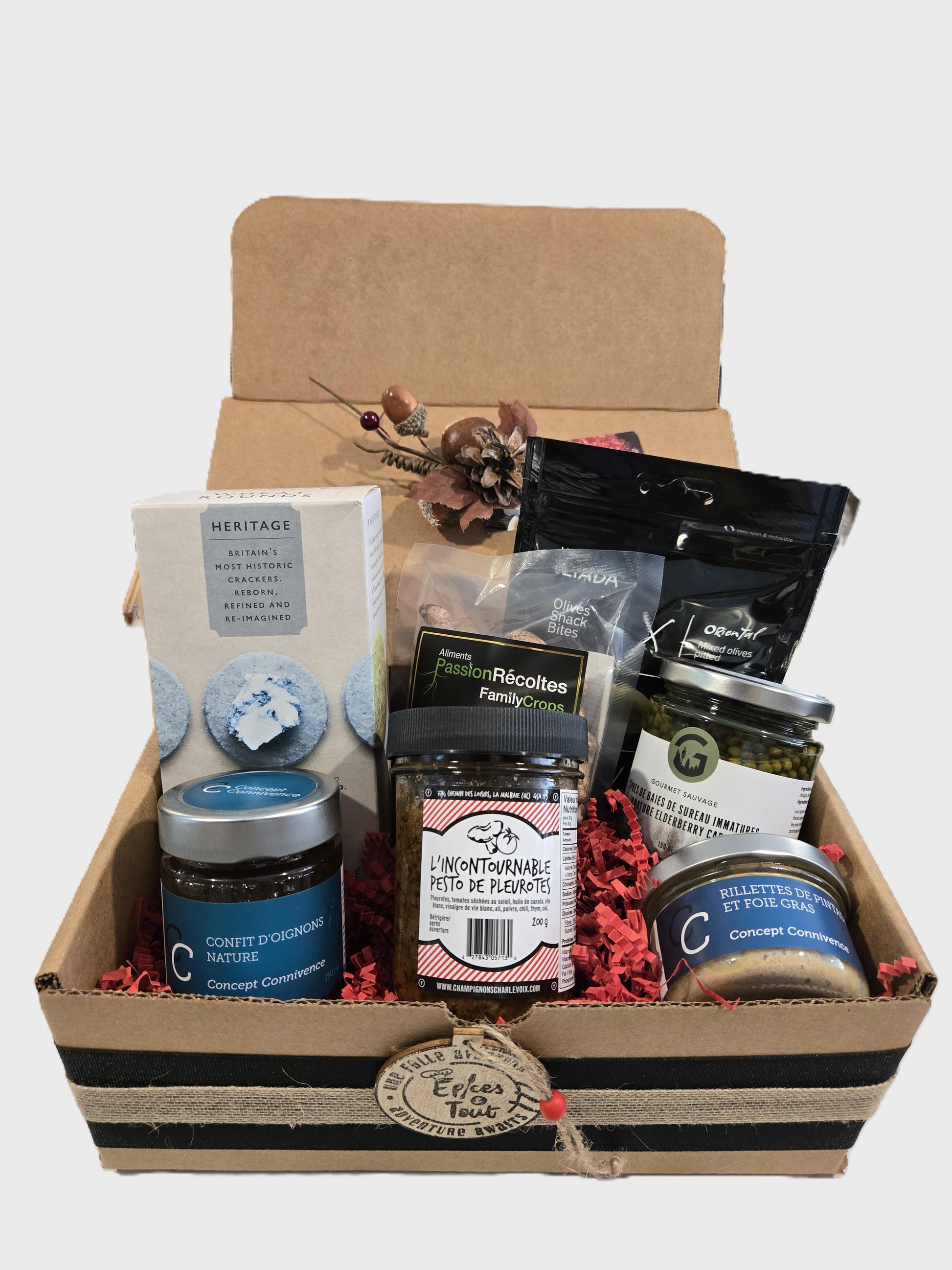 Une sélection alléchante de grignotines pour accompagner vos cocktails et mocktails préférés ! Noix de cajou grillées au feu, olives farcies au citron, terrine, câpres de baies de sureau, pesto de pleurotes, confit d'oignons, craquelins- ouvrez et servez !